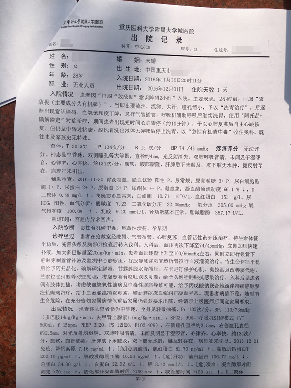 重庆医科大学附属大学城医院开具的李琳出院记录显示,患者因“口服‘敌敌畏’意识障碍2小时”入院,入院时间为11月30日晚8时11分,洗胃治疗后,以急性有机磷中毒收治中心ICU。
